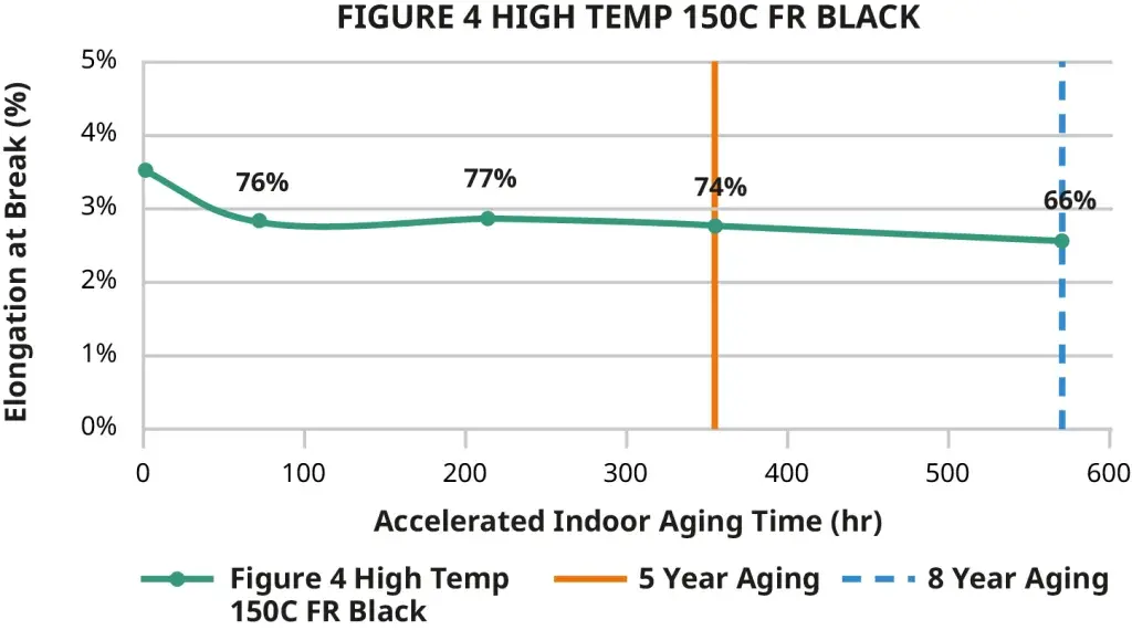 Figure 4 High Temp 150°C FR Black is engineered to give long-term environmental UV and humidity stability and long-lasting black color. This material has been tested for its ability to retain a high percentage of its initial mechanical properties over a period of time. This test data provides real performance conditions to consider for the application or part.
