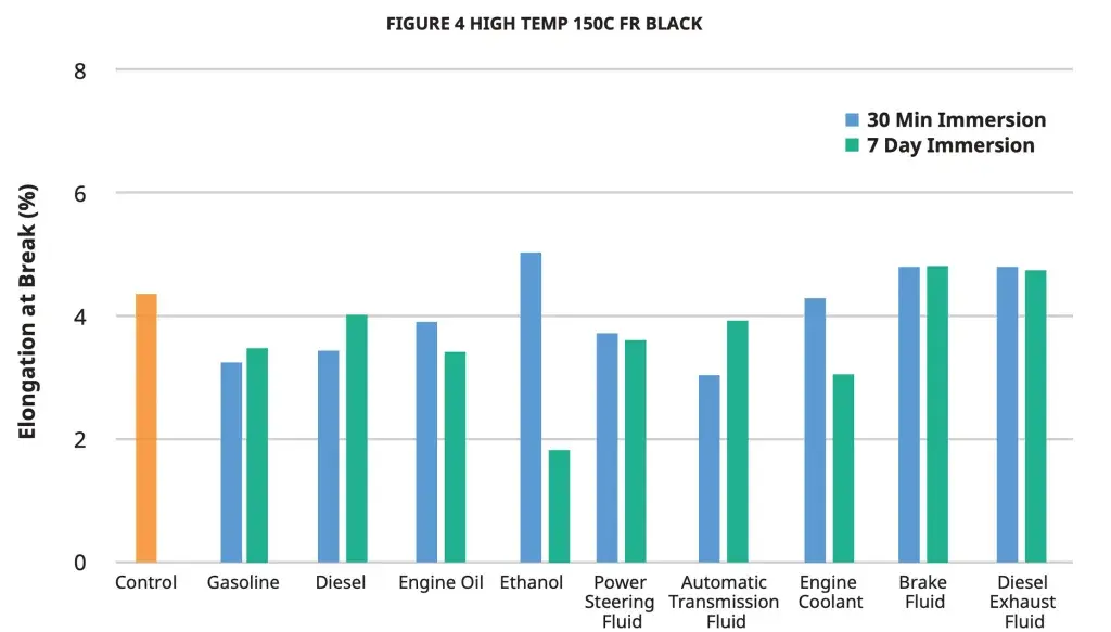 Hydrocarbons and cleaning chemical compatibility can be critical to application compatibility. Figure 4 High Temp 150°C FR Black parts were tested for sealed and surface contact compatibility per ASTM D543 test conditions and per USCAR2 test conditions. The full data sheet includes additional data tables for tensile strength, tensile modulus, and elongation at break.