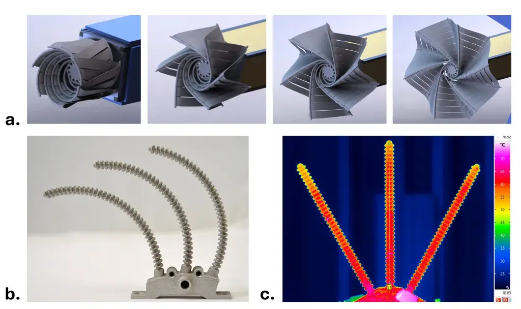 图 2:a. 采用增材制造的形状记忆合金 (SMA) 辐射器概念图,径向热管分支从紧凑收纳态动态展开;b. 配备高柔性波纹管热管臂的 SMA 原型演示装置;c. SMA 分支波纹管热管热成像图,呈现近等温运行。(图片由宾夕法尼亚州立大学提供)
