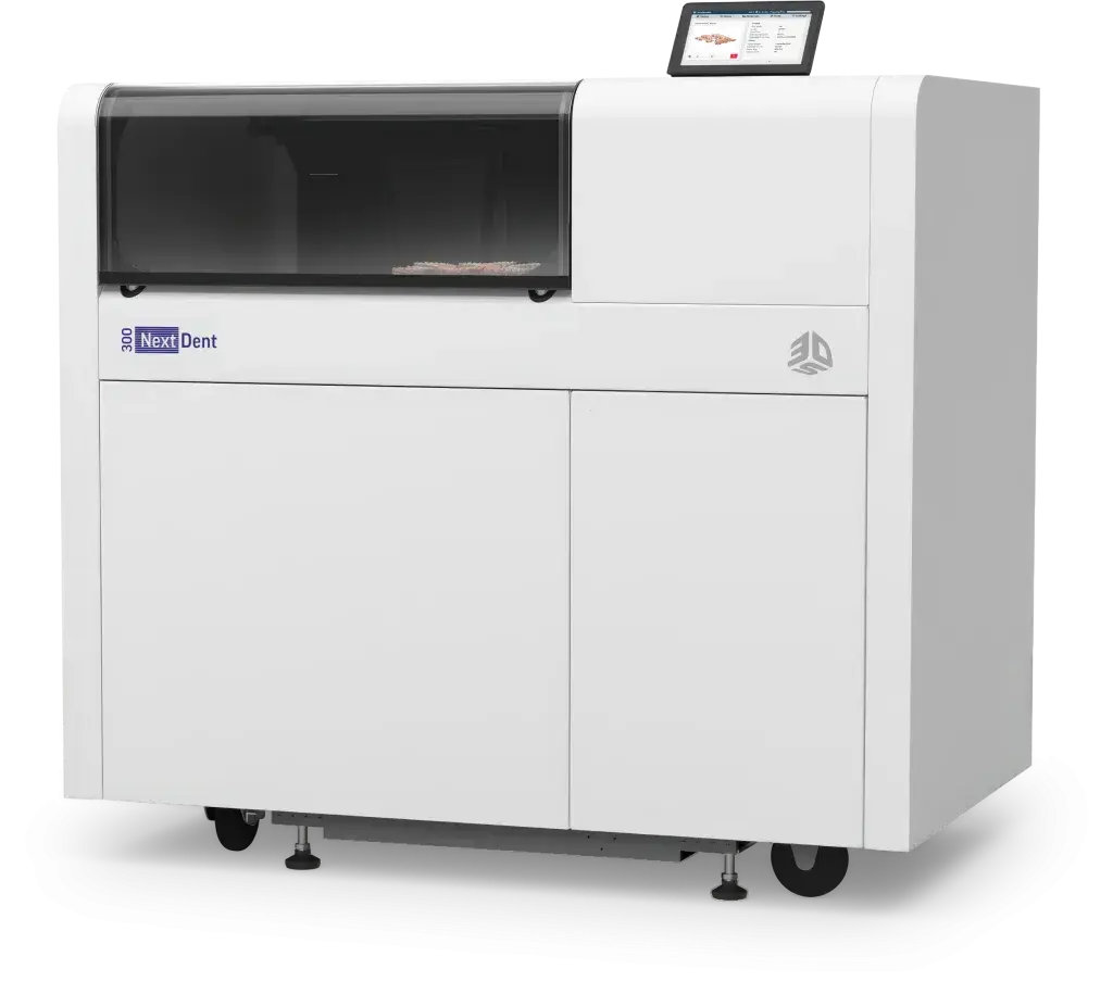 NextDent 300 是 3D Systems 经过 FDA 批准的完整工作流程解决方案的组成部分,可以帮助大批量牙科实验室快速生产义齿。